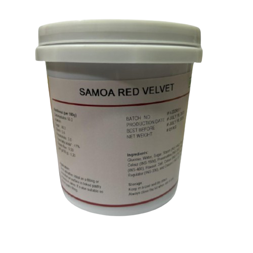 SAMOA RED VELVET Samoa Red Velvet Injectable, bakestable, flavored, and ready-to-use cream. Specially designed to guarantee average piece tenderness and long shelf life. Instagram Linkedin Contact a salesperson Duration 12 months Certificates Available formats 2.5 kg x 6